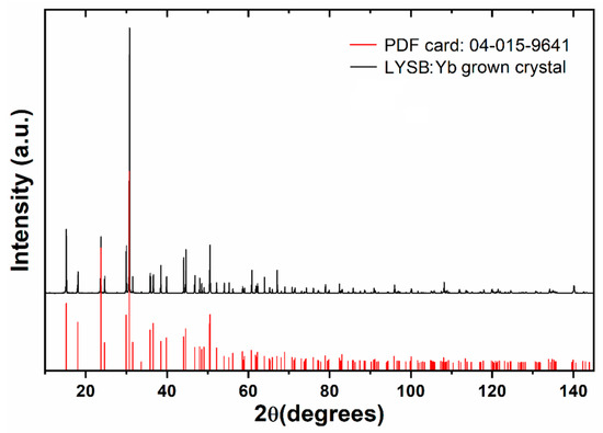 XRPD spectrum of LYSB:Yb crystal (black line) together with PDF card 04-015-9641 (red sticks) of LGSB crystal. Reprinted with permission from ref. [44], copyright 2020, Elsevier.