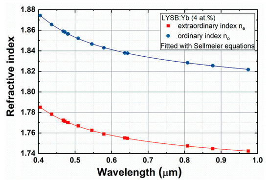 The refractive indices of the LYSB:Yb (4 at.%) crystal were also measured using the minimum deviation method. The measured refractive indices (Table 8) were fitted according to the Sellmeier equations: