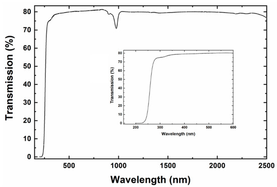 The optical transmission spectrum of the LYSB crystal was registered at room temperature on a 1.75 mm thick c-cut crystal sample using a Varian Cary 5000 UV-Vis-NIR spectrophotometer. As shown in Figure 10, the LYSB crystal had a wide optical transparency window with a high transmittance of over 80% in the wavelength range of 400–2450 nm. No absorption peaks were detected in this wavelength range, and the UV cut-off wavelength was below 200 nm (the lower limit of the spectrophotometer). Compared to the LGSB crystal grown by the Czochralski method [12], which has a UV cut-off wavelength of 230 nm and some absorption peaks in the UV range due to the absorption of Gd3+ ions, the LYSB crystal is more suitable for use in various NLO devices in the UV domain. The energy band gap was calculated from Tauc’s plot (the inset of Figure 10) as Eg = 6.0 eV, close to the value of 5.7 eV reported for the YAB crystal [16].