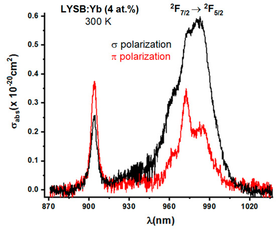 The polarized absorption cross-section spectra of Yb3+ ions assigned to the 2F7/2 → 2F5/2 transitions at room temperature are presented in Figure 21. One can observe that the absorption cross-section (σabs) corresponding to the line centered at 904 nm was higher for π-polarization, having a maximum value of σabs = 0.37 × 10−20 cm2. On the other hand, the absorption cross-section at 980 nm was higher for σ-polarization, having a maximum value of σabs = 0.6 × 10−20 cm2 with an associated FWHM of 33 nm. Compared to other huntite-type crystals, the value of σabs at 980 nm was smaller than that of the well-known YAB:Yb crystal (σabs = 3.4 × 10−20 cm2) [45] and close to the value for the LGSB:Yb crystal (σabs = 0.47 × 10−20 cm2) [46]. However, the FWHM bandwidth was larger, with a factor of 1.65, than the corresponding value for the YAB:Yb crystal (FWHM of 20 nm at 975 nm) [45], thus being advantageous for laser diode pumping.
