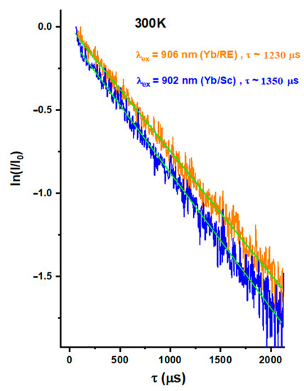 The room-temperature emission kinetics of the 2F5/2 level of Yb3+ ions was measured under excitation from the same OPO laser using a Tektronix 2024B oscilloscope for the detection. The decay curves were recorded by monitoring the emission line at 1070 nm under selective excitation at 902 and 906 nm and are shown in Figure 25. To measure an accurate value of the 2F5/2 level lifetime, unaffected by reabsorption processes, the 4 at. % LYSB:Yb powder sample was 99% diluted with KBr. The decay curves were measured to be about 1230 µs for the Yb/RE center (λex = 906 nm) and 1350 µs for the Yb/Sc center (λex = 902 nm), being long enough to allow efficient energy storage on the emitting level. Compared to other well-known Yb-doped crystals, the values of the 2F5/2 level lifetime for each Yb center in 4 at. % LYSB:Yb crystal were considerably higher than the values of 951 µs obtained for Yb:YAG crystal [48] and 680 µs for YAB:Yb crystal [45], indicating that 4 at. % LYSB:Yb crystal has suitable properties for generation of high-energy laser pulses.