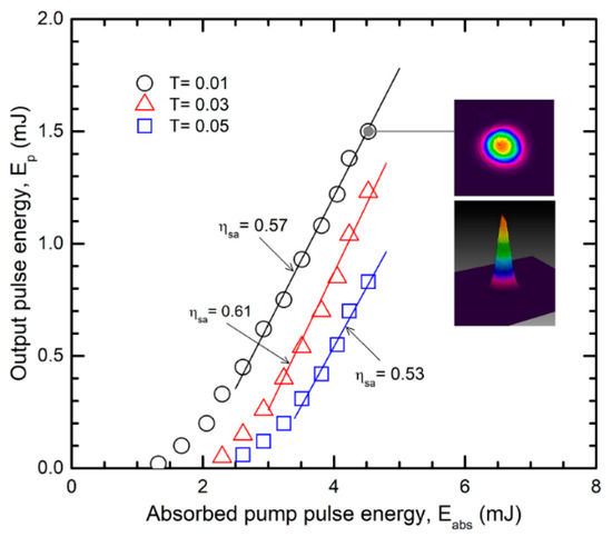 Laser pulse energy (Ep) versus absorbed energy of the pump pulse (Eabs). The laser beam distribution at the highest output level is shown in the figure inset. Reprinted with permission from ref. [44], copyright 2020, Elsevier.