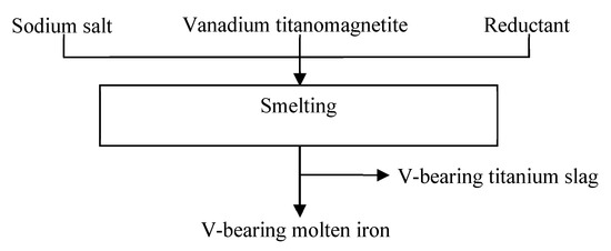 Firstly, raw ore, anhydrous Na2CO3, and anthracite were mixed in a ratio of 10:6:3 and placed in a graphite clay crucible. When the temperature of the furnace rose to the setting value, it was held on for 10 min, and then the graphite clay crucible was quickly moved into the furnace chamber. The reaction timing began until the temperature stabilized again to the setting value. After the reaction, the crucible was taken out and cooled in the air. After cooling to room temperature, pig iron samples were separated from the slag for analysis. The flow sheet of the smelting process of vanadium titanomagnetite is shown in Figure 1.