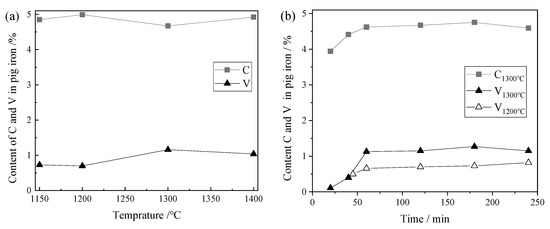 As shown in Figure 2a, the C content in pig iron at different melting temperatures had little change with an average content of about 4.85 wt.%. However, the V content in pig iron increased with the increase in temperature. The V content was 0.70 wt.% at 1200 °C and 1.16 wt.% at 1300 °C.