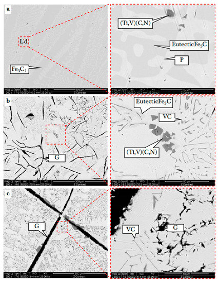 By further comparison of Figure 3a,c, it can be seen that the eutectic (Fe,V)3C region originally in L’d was greatly reduced, while a large amount of VC phase appeared in the gap of the G phase, indicating that (Fe,V)3C solid solution was in a kind of metastable phase, which would decompose into the G phase and generate VC under certain conditions. The morphology of VC was consistent with the literature [15,16,17,18]. It also showed that excessive element V, a strongly graphitized element, could reduce the stability of Fe3C.