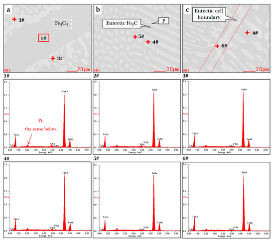 The content of C was different in various phases; thus, it could be inferred that the content of V in different pig iron structures was also changing. For hypereutectic white cast iron, it depended on its solubility in the Fe3C phase and the F phase, as well as the proportion of the two phases in the structure. The microstructure of V-bearing pig iron can be further analyzed in Figure 3.