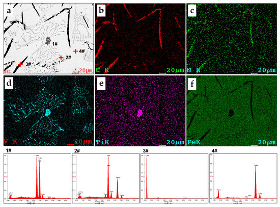 SEM-EDS images of the V-bearing pig iron at 1300 °C: (a) (Ti,V)(C,N),VC, graphite, and austenite phases in pig iron; (b–f) mapping scanning measurement of C, N, V, Ti, and Fe elements.