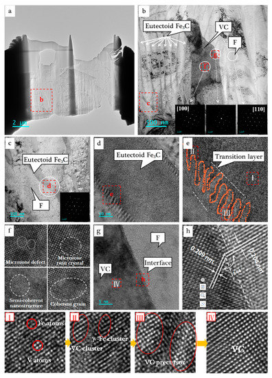 Figure 6f shows the high-resolution structure of VC phases, which were full of various microdefects, microtwins, semi-colattice nanostructures, and colattice nanoparticles. Figure 6g,h shows the interface structure of VC and F phases. It can be seen that there were small fluctuations of about 3–4 atomic layers thickness at the interface, from which the mismatches of semi-coherent interface micro-regions and noncoherent dislocations can be seem. The VC and A phases were eutectic precipitated from the (Fe,V)3C matrix. When the temperature was above 723 °C, both phases had an FCC structure. Therefore, the interface should be a coherent or semi-coherent interface. When the temperature was below 723 °C, the A phase transformed into the F phase. Its structure changed from FCC to BCC, during which the atomic rearrangement led to the mismatches of the interfacial lattice. As can be seen from the Figure 6h, there was a difference of 0.005 nm in the crystal plane spacing between VC and F phase; thus, it showed periodic mismatches, forming a stepwise dislocation.