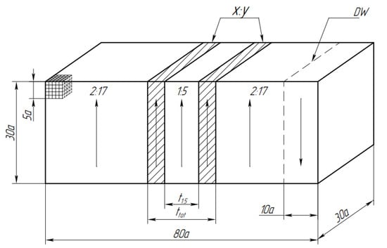 Schematic diagram of the initial magnetization state of the micromagnetic model containing two 2:17 phase cells and complex (x:y/1:5/x:y) cell boundary, where x:y = 2:7 or 5:19, and showing the existence of magnetic 180° domain wall inside the right 2:17 cell before applying an external magnetic induction (field); DW is the domain wall; t is the width; and a = 1 nm.