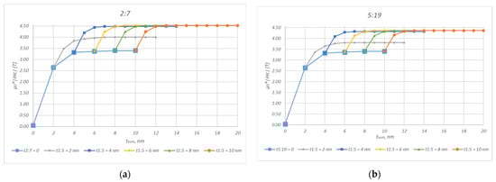 We quantified the effects of the total width (tsum = t1:5+ t2:7 or tsum = t1:5+ t5:19) of the 1:5H and 2:7R (or 5:19R) cell boundary phases on the coercivity (μ0∙IHc) of the model magnet, as shown in Figure 3. An important feature of these curves (μ0∙IHc vs. tsum) is the presence of a plateau at thicknesses of each phase of more than 4–5 nm. On the one hand, this effect can be explained by the fulfillment of the necessary geometric condition associated with the limitations of our model: ti > δDW > δex, where i = 1:5, 2:7, 5:19 and 2:17.