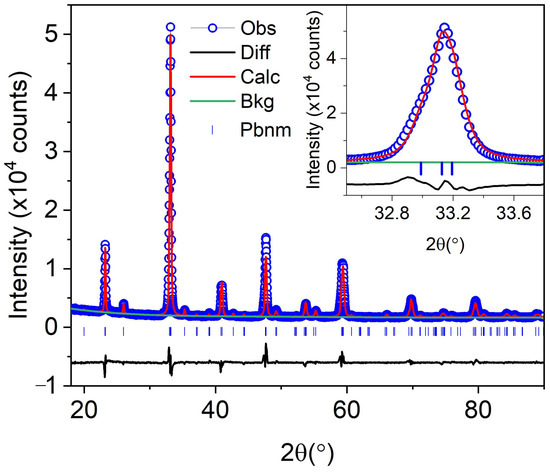 Bruker AXS D2 Phaser X-ray powder diffractometer was used to check phase purity. Data were collected at room temperature using Cu-Kα radiation (λ = 1.5418 Å) in the 2θ range of 10–90° with a scan step of 0.02° and 0.2 s per step. Rietveld refinement was performed using TOPAS 6. Refined parameters include background (Chebychev function, 5 order), sample displacement, lattice parameters, crystallite size (L and G), strain L, and atomic positions. Thermal parameters were not refined.