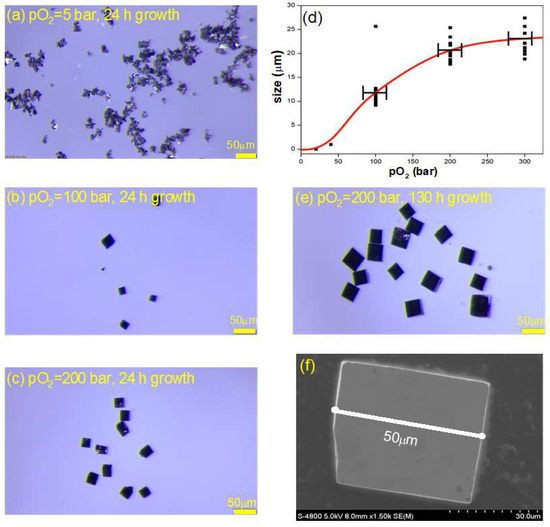 NdNiO3 crystals grown under different pO2. (a) pO2 = 5 bar, growth time 24 h; (b) pO2 = 100 bar, growth time 24 h; (c) pO2 = 200 bar, growth time 24 h. (d) The relationship between grain size and pO2 under the same growth conditions (Error bars represent the oxygen pressure deviation, and the red curve is only a guide for the eye); (e) pO2 = 200 bar, growth time 130 h; (f) SEM image of NdNiO3.