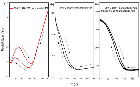 The resistivity of NdNiO3 from three samples: (a) annealed at 650 °C for 48 h under pO2 = 280 bar, (b) annealed at 800 °C for 12 h under pO2 = 1 bar, and (c) initially annealed at 800 °C for 12 h under pO2 = 1 bar and then at 650 °C for 12 h under pO2 = 280 bar. Arrow indicates heating/cooling process.