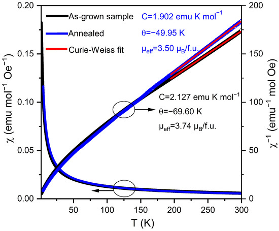 Magnetic susceptibility. Complementary to transport properties, magnetic measurements offer an additional way to assess the properties of our sample. It was reported that antiferromagnetic order occurs concomitantly with MIT for NdNiO3 [22]. The temperature dependent DC magnetic susceptibility (χ) and the inverse magnetic susceptibility (1/χ) of as-grown NdNiO3 and annealed at 650 °C for 48 h under pO2 = 280 bar are shown in Figure 5. No anomaly, discontinuity, or change in slope, which would mark the onset of magnetic ordering, was observed down to 2 K. This is likely because the magnetic susceptibility is dominated by the paramagnetic contribution of Nd3+, which mask the weak signal of the Ni sublattice. A Curie–Weiss fit to the as-grown data in the range of 200–300 K, χ = C/(T-θ), where C and θ are the Curie and Weiss constants, respectively, yields C = 2.127 emu K mol−1 and θ = −69.6 K. The resulting effective moment is µeff = 3.74 µB/f.u., which is close to the expected value of 3.89 µB/f.u. of the free ion Nd3+. The large negative value of the Weiss constant indicates strong antiferromagnetic interactions.