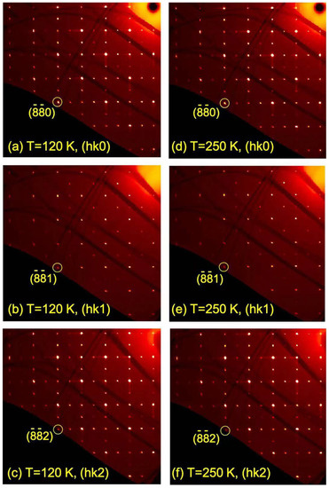 (a) Pseudocubic (hk0) planes (a~7.6 Å) of as-grown NdNiO3 measured by single-crystal X-ray diffraction at 120 K; (b) Pseudocubic (hk1) planes at 120 K; (c) Pseudocubic (hk2) planes at 120 K; (d) Pseudocubic (hk0) planes at 250 K; (e) Pseudocubic (hk1) planes at 250 K; (f) Pseudocubic (hk2) planes at 250 K.