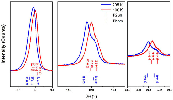 High-resolution synchrotron X-ray powder diffraction intensities of as-grown NdNiO3 in the 2θ range of 9.65–9.9°, 11.85–12.15°, and 23.9–24.3° measured at 100 K (λ = 0.458956 Å) and 295 K (λ = 0.458961 Å). Blue (bottom) and red (top) bars correspond to Pbnm and P21/n, respectively.