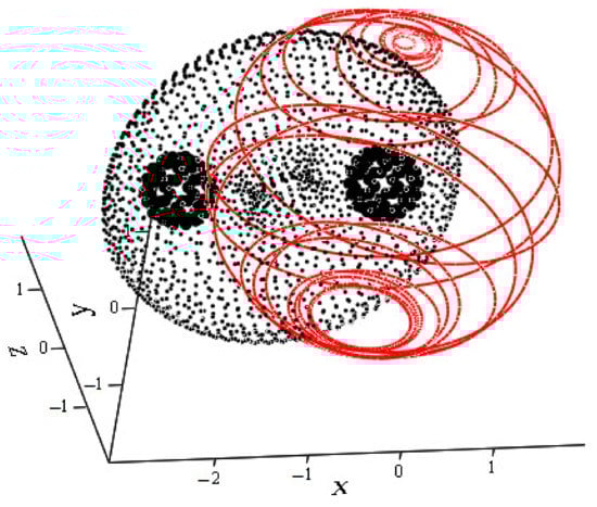 Figure 1 presents the case of rotation of the torus with an initial angular velocity of In this case, the fullerenes are located diametrically opposite on the (oy) axis and are fixed on the axial circumference of the torus. The red line in this figure is the trajectory of one of the peripheral carbon atoms that does not lie on the (ox) axis and has a y-coordinate value close to the outer radius of the torus. This line demonstrates somersaults of the considered molecular structure during its rotation around an axis with an intermediate moment of inertia (oy axis), i.e., demonstrates the instability of Louis Poinsot [23,24,25]. The (oz) axis is directed perpendicular to the initial position of the torus plane. In what follows, the motion of the molecular structure under consideration is analyzed in the absolute frame of reference thus introduced.