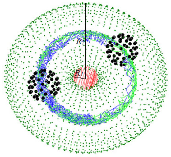 Orbital motion of fullerenes. In the center of the figure, the trajectory of the center of mass of the nanotorus; inside the torus, the trajectory of the centers of mass of fullerenes.