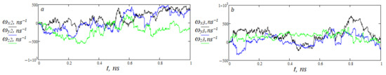 Projections of the angular velocities of fullerenes. (a)—the case of "frozen" fullerenes. (b)—case of free fullerenes.