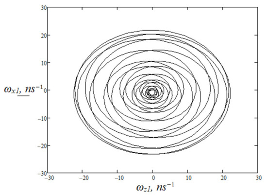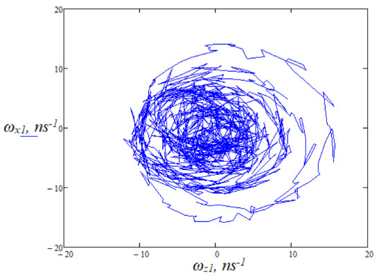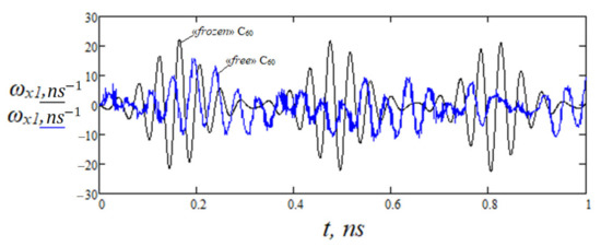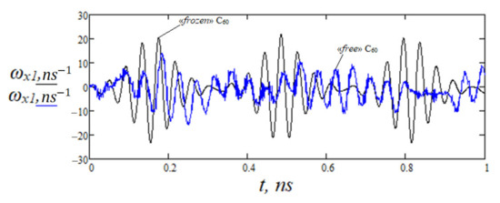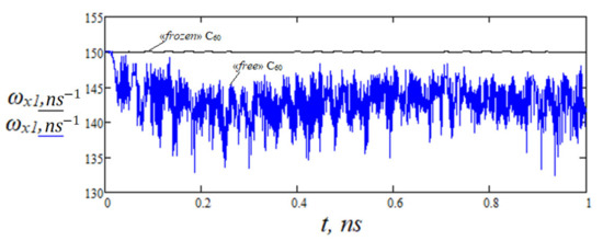 Figure 4, Figure 5 and Figure 6 show the projections of the angular velocities of the torus in these cases. It can be seen that the rotation of a single structure is periodic at the beginning of the movement. In the second case, some quasi-periodic motion is established on a time interval of 1 ns. Figure 4 shows what part of the initial rotational energy of the torus is converted into the kinetic energy of fullerenes. As can be seen from Figure 4 and Figure 6, in the case of “frozen” fullerenes, one can clearly distinguish bi-oscillations, which are determined by the presence of two frequencies—the initial frequency of rotations of the system and the frequency of somersaults by V. Dzhanibekov [26].