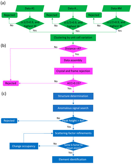 - Brewster, A.S.; Waterman, D.G.; Parkhurst, J.M.; Gildea, R.J.; Young, I.D.; O'Riordan, L.J.; Yano, J.; Winter, G.; Evans, G.; Sauter, N.K. Improving signal strength in serial crystallography with DIALS geometry refinement. Acta Crystallogr D Struct Biol. 2018, 74 Pt 9, 877894. [Google Scholar] [CrossRef] [PubMed]