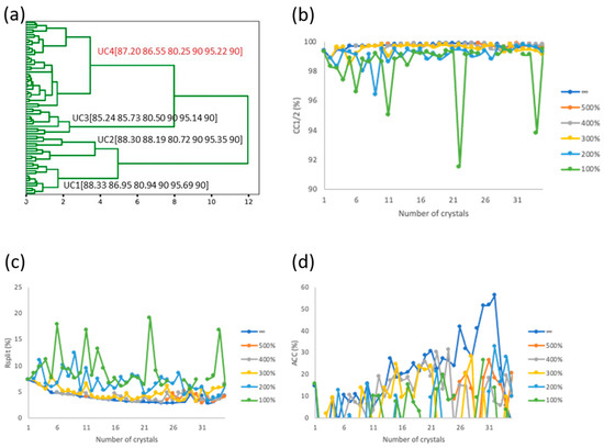 Seventy single crystal data sets (600 frames for each crystal) were indexed and integrated independently as 10 accumulated wedges per crystal (1–60, 1–120, …, 1–600) using PyMDA [19] which integrates the software DIALS, POINTLESS, and AIMLESS [24,25,26,27]. All wedges were scaled, and the largest wedges which have a CC1/2 value above 0.9 at 4 Å were chosen for each crystal. Seventy single-crystal data sets were classified based on the variation of their unit cell parameters [28]. Among them, 35 crystals in cluster 4 (UC4) had acceptable diffraction quality and were used for downstream assembly in PyMDA (Figure 1a). To remove outlier crystals, crystal rejection was performed one by one from the 35 crystals using PyMDA, resulting in 32 crystals for the final data assembly. The assembled data sets after each crystal rejection were further subjected to a different extent of frame rejection by using PyMDA (Figure 1b). The extent of frame rejection is defined by frame_cutoff = [min(SmRmerge) × (1 + decay)], where min(SmRmerge) is the lowest SmRmerge, reported by AIMLESS, within a single-crystal data set; and decay is a rejection ratio of none, 500%, 400%, 300%, 200%, and 100%. Frames with SmRmerge larger than frame_cutoff were excluded from the assembly in AIMLESS. For example, 200% indicates that frames with a SmRmerge of 200% more than min(SmRmerge) are rejected from scaling and merging [18,19]. Data reduction and assembly statistics are shown in Table 1.