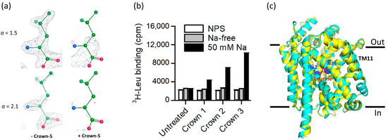 Na+-free LeuT is unstable at a physiological pH. Therefore, stabilization strategies such as mutations, low pH, and the use of Fab fragments were employed to obtain LeuT structures in apo conformations [45,46]. Here, we took a different approach to obtain LeuT structures in an apo conformation (i.e., Na+-free) at a more physiological pH (pH of 7.0) by removing Na+ in LeuT crystals using Crown-5, a Na+-chelating compound [47]. We initially tried to soak large crystals with Crown-5, but those crystals were cracked and could not be used for diffraction data collection, suggesting that Na+ depletion from LeuT crystals caused conformational changes and destroyed the crystal lattice. To overcome this issue, we used microcrystals of 10–20 µm in size. We hypothesized that microcrystals may tolerate the conformational changes induced by the diffusion of Crown-5 and Na+. As we expected, microcrystals survived after soaking with Crown-5 at a concentration of 3 mM. These soaked microcrystals preserved diffraction quality at 3.8 Å resolution (Table 1). Compared to the Na+ and Leu-bound LeuT structure, the structure we obtained after Crown-5 soaking shows a significant loss of electron densities for the substrate Leu (Figure 4a). This observation is consistent with the fact that Leu can only bind to LeuT in the presence of Na+ [10]. Removing Na+ from the assay medium impaired 3H-Leu binding to LeuT (Figure 4b). Because the anomalous signals from a single crystal are weak and the resolution is low, we cannot use anomalous difference Fourier peaks or Fo-Fc electron densities to validate the depletion of Na1 and Na2. Our result nevertheless indicates that most of Na1 were removed by Crown-5 so Leu binding was weakened. The depletion of Leu did not yield observable conformational changes of the Na1 and Na2 sites, consistent with the previously determined apo LeuT structure [45] and functional data that show that binding of 22Na+ to LeuT is indistinguishable in the presence or absence of Leu [10].