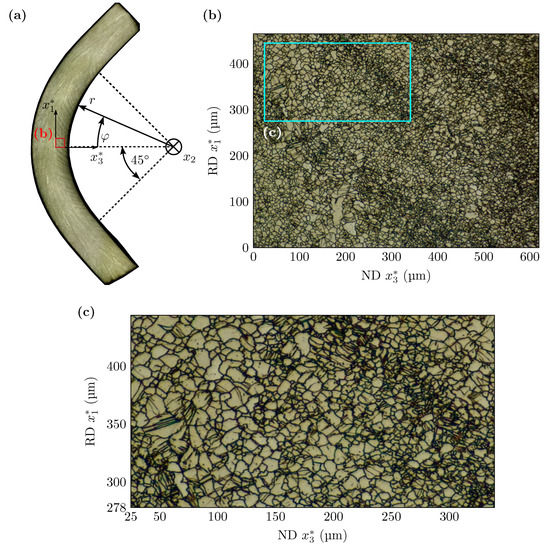 - The hot forming process leads to the formation of BTG in the gauge area on the compressively loaded concave side of the specimen. These extend at a 45° angle to the sheet plane approx. 1 in the direction of the center of the sheet wall thickness. The EBSD and light microscope investigations of the microstructure after applied cyclic loading showed that these BTGs are no longer detectable. The reason for this is that the occurrence of twins distributes evenly after cyclic loading. The information on how far the material twins toward the center of the sheet wall thickness was used to determine the highly strained volume to apply the CHV.