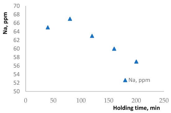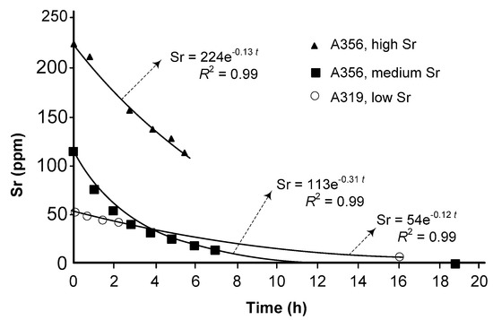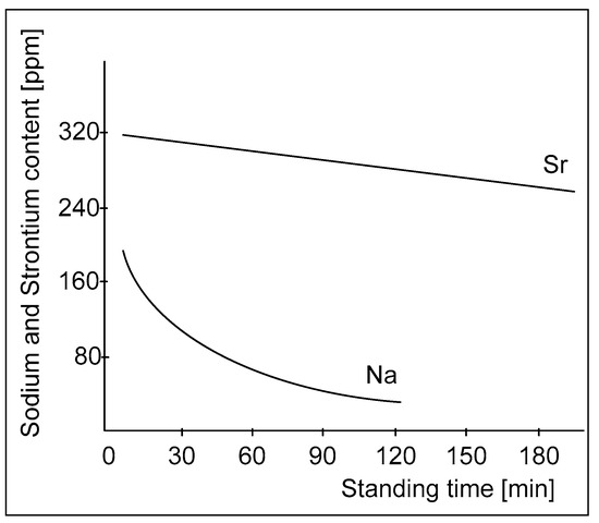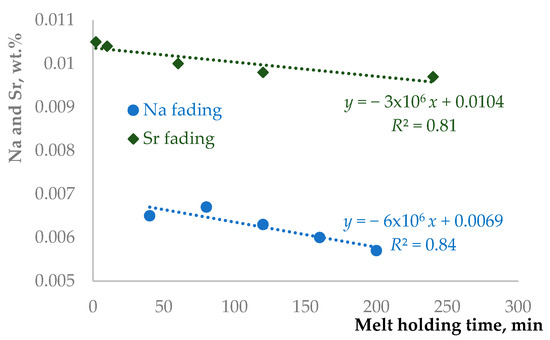 Figure 1 indicates that both modifiers, Na and Sr, fade during holding in the melting furnace [16]. The fading of Na (~1.3 ppm Na/min) is significantly faster than Sr (0.38 ppm Sr/min), and this loss is visible during all observed holding times. Figure 1 shows that after 2 h, Na almost disappears from the melt, while Sr is still present in the amount of 240 ppm after 3 h of holding time which can modify the aluminum-silicon eutectic structure.