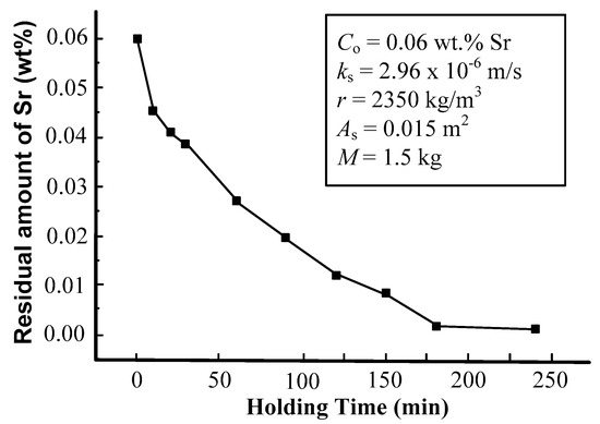The previously calculated k and ks can be used to rapidly estimate Na and Sr fading under production and/or experimental conditions. These constants’ validity in quantifying modifier fading is demonstrated using data from the literature [26]. Figure 7 depicts the experimental data related to the fading of Sr during melt holding in the small laboratory furnace (Surface area ~0.015 m2). A total of 1.5 kg of the A356 (Al–7Si–Mg) alloy was melted at 750 °C, and 0.06 wt.% of Sr was added to the melt and hold for 240 min. The first sample for chemical analysis was taken 30 min after Sr addition, and all other samples were collected in the time interval of 30 min.