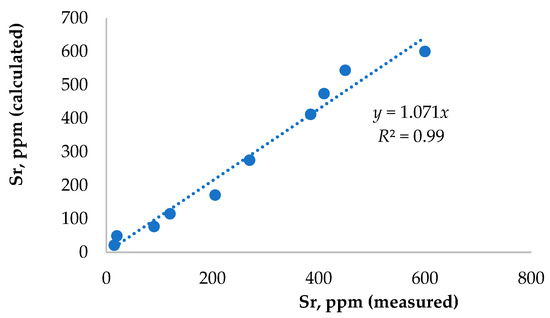Applying Equation (3) and using the ks from Table 4 for high Sr content (ks = 2.96 × 10−6), the corresponding Sr concentration (C) during holding time can be calculated. Figure 8 depicts a plot of the calculated values for Sr fading versus their experimentally determined counterparts. The calculated values for Sr fading show a high level of reliability (R2 = 0.99). Therefore, it can be considered that experimentally determining the ks allows foundry employees to predict with high accuracy the removal rate of modifiers from the aluminum melt during various holding times.