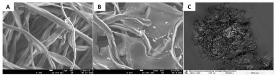 (A,B) SEM images of the untreated cotton and the conductive nanocomposite cotton at a concentration of 36.75 wt%; (C) TEM of the conductive nanocomposite cotton.
