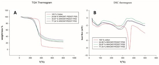 Thermal degradation: The effect of the amount of PEDOT: PSS/MWCNT nanocomposite on the thermal degradation of conductive nanocomposite cotton was investigated to understand the change in thermal degradation. Figure 2A shows the thermogravimetric analysis (TGA) of the untreated cotton and the treated cotton with nanocomposites of 24.69, 35.87 and 77.24 wt%, respectively. The TGA of the untreated cotton fabric showed a small weight loss at 135 °C due to moisture content removal, and for the cotton fabrics treated with the nanocomposite, the small transition at 155 °C is due to moisture content removal. The degradation of untreated cotton fabric starts at approximately 310 °C (the onset temperature) and reaches its maximum weight loss at approximately 400 °C (the decomposition temperature), which is due to depolymerization by transglycosylation reactions (red curve in Figure 2A). Conversely, the onset temperature and decomposition temperature of the treated cotton fabric with different concentrations of the PEDOT: PSS/MWCNT nanocomposite starts at approximately 210 °C and 373 °C, respectively, which is lower than the onset and decomposition temperatures of the untreated cotton fabric. This is attributed to the lower thermal stability of PEDOT/PSS, which affects the overall thermal degradation. In addition, it is clear that the thermal degradation of the nanocomposite samples was independent of the concentration, as shown in Figure 2A.