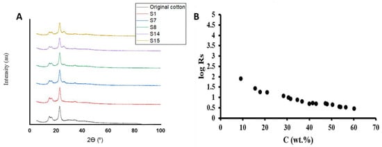 (A) XRD analysis of the untreated cotton and the cotton treated with different nanocomposite concentrations (S1 = 28.42 wt%, S7 = 41.62 wt%, S8 = 43.14 wt%, S14 = 56.53 wt%, and S15 = 60.27 wt%); (B) Logarithm of the resistance of the conductive cotton fabric as a function of nanocomposite.