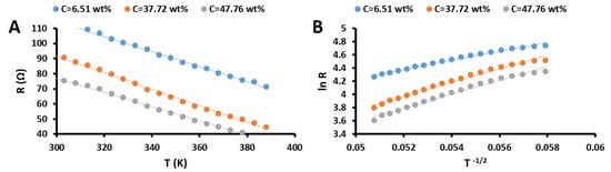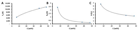 where is the resistance prefactor and is the characteristic temperature coefficient, which is measured by the degree of disorder. The plots between and for the nanocomposite samples are shown in Figure 4B. The fitted values of , and the values of at low and high temperatures for both concentrations are shown in Table 3. The plots between and C and between and C for the nanocomposite samples are shown in Figure 5. In Figure 5A,B, the connections between the measurement points have been inserted to determine the exact relationship between and C and between and C, respectively. As can be seen in Figure 5A, the characteristic temperature increases with the increasing concentration of MWCNTs in the nanocomposite, which can be described by the empirical relation, the fitting relation, and , with 0.998. The values of the resistance prefactor presented in Figure 5B indicate that the resistance prefactor decreases with the increasing concentration of MWCNTs and can be described by the power law according to the fitting relation with .