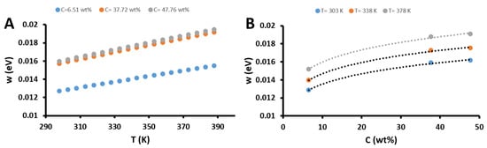 The plots between w and T, Figure 6A, show that the activation energy increases with increasing temperature. The activation energy increases from to and from to and from to for the cotton fabrics treated with nanocomposite that contains MWCNTs of 6.51 wt%, 37.32 wt%, and 47.76 wt%, respectively. To find out the effect of MWCNT concentration on activation energy, the relationship between w and C was investigated at three different temperatures, namely 303, 338 and 378 K, as shown in Figure 6B. The relation between w and C can be described by the power law according to the fitting equation with 0.998.