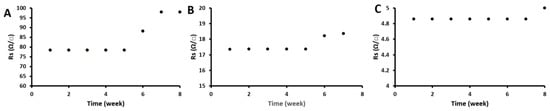 Electrical stability of the nanocomposite over a period of eight weeks at concentrations of (A) 9.21 wt%; (B) 21.94 wt%; and (C) 50.46 wt%.