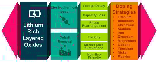Cobalt substitution is a remarkable challenge that unbalances the electronic structure and alters the thermodynamic stability of LRLOs. As an example, Kou et al. [68] showed the negative effects of the reduction of cobalt content on the discharge capacities and working voltages of a homologous series of LRLOs with general formula Li1.2Ni0.2−xCo2xMn0.6−xO2 (x = 0–0.05). In recent years, many different doping strategies or compositions have been investigated to prove the feasibility of Co-free or Co-poor LRLOs with promising performances from il LIBs.