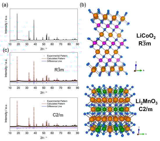 (a) XRD pattern of Li1.2Mn0.54Ni0.13Co0.13O2 acquired with a Rigaku SmartLab (Bragg-Brentano geometry, CuKα radiation), (b) pictorial structure of LiCoO2 ( symmetry; ICSD: 74330) and Li2MnO3 ( symmetry; ICSD: 165686) where Li and metals layers can be seen. Lithium is orange, Co is pink, Mn is green, and O is blue. (c) Rietveld refinement, obtained with GSAS-II of XRD pattern, assuming or the symmetry.