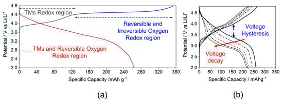 The structural ambiguity of LRLOs directly reflects on to the sluggish rationalization of the corresponding redox mechanism in batteries and the unsatisfactory comprehension of the structural evolution occurring during repeated cycles of electrochemical lithium-ions extraction/insertion. In Figure 3a, the typical potential profile of the first cycle obtained is shown for an LRLO with the Li1.2Mn0.54Ni0.13Co0.13O2 stoichiometry [33]. The first electrochemical process shows a two-step charge profile: a slope up to 4.4 V, where the Li extraction is balanced by the oxidation of transition metals (Co3+/Co4+ and Ni2+/Ni3+/Ni4+,) and a long plateau above 4.5 V, where the further lithium removal is balanced by the activation of the O2−/O− redox couple [34,35]. The manganese is not involved in this first electrochemical process due to its stability in +4 oxidation state. The potential profile changes drastically after the first charge (Figure 3b), as well as in the following cycles, leading to the so-called voltage (or working potential) decay upon cycling and consequently increasing the voltage hysteresis between charge and discharge. Focusing on the first cycle, it is important to underline that the electrochemical reaction occurring along the 4.5 V vs Li plateau in the first cycle is only partially reversible and disappears during the discharge step. In fact, the reinsertion of Li+ into the LRLO occurs not only by the exploitation of the Co/Ni/O redox couples but also by the reduction of Mn4+ to Mn3+/2+ near 2 V [35].