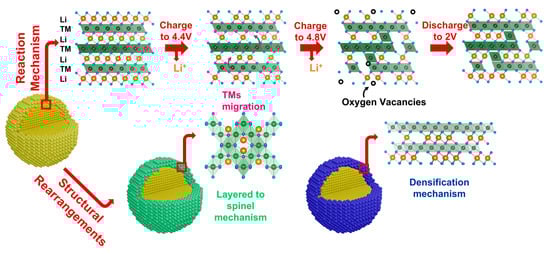 One direct effect, induced by the molecular oxygen release in the phase composition and the structure of LRLOs after the first charge, is the interdiffusion of metal cations from the bulk to the surface of the single crystal particles, and the consequent phase reorganization (Figure 4) [46,47].