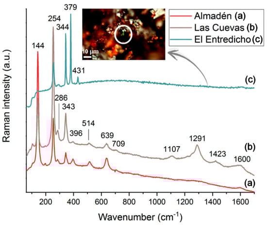 The band at around 145 cm−1 could be attributed either to cinnabar or to the presence of anatase (TiO2). The Raman spectrum of anatase is known for its vibrational bands at 144, 197, 399, 513, 639 and 792 cm−1 [,]. On the mineral fragments of Almadén and Las Cuevas, its bands at around 197, 399, 513, and 639 cm−1 are also observable. In El Entredicho, no additional bands of this TiO2 polymorph were registered, which may suggest that the band at 145 cm−1 is related to cinnabar rather than to anatase in this ore. It is notable that the 145 cm−1 band is also present in all the scraped powdered samples, a purified form of the cinnabar ore, which reinforces the hypothesis of the attribution of this band to cinnabar and not to anatase in El Entredicho. On the other hand, the 127–129 cm−1 and 465 cm−1 bands observed in the spectra acquired in all ores using the confocal instrument can be easily ascribed to α-quartz [].