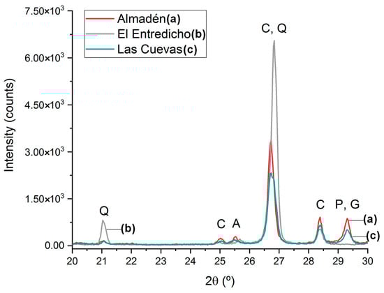 In agreement with the Raman measurements, X-ray diffraction analyses confirmed the occurrence of anatase in Almadén and Las Cuevas, as well as the detection of quartz in all ores, being predominant in El Entredicho (see Figure 3). In this last case, the strong contribution of the 26.63 2θ quartz diffraction peak induces a shift in the 26.29 2θ cinnabar peak. These observations allow hypothesizing that Almadén and Las Cuevas have a closer mineralogical composition compared with El Entredicho. Other mineral phases observed by XRD were pyrophyllite (Al2Si4O10(OH)2) (shown in Figure 3) and kaolinite (Al2Si2O5(OH)4), both in Almadén and Las Cuevas, gypsum (CaSO4·2H2O) in Almadén (shown in Figure 3), and dolomite (CaMg(CO3)2) in El Entredicho.
