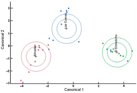 Afterward, a Canonical Discriminant Analysis (CDA) was performed using the Raman spectra acquired on the direct measurements of the mineral samples using the portable instrument (see Figure 4). The values contained in the first ellipse (the smaller one) are in the 95% confidence level, while the other ellipse groups 50% of the observations. This statistical treatment allowed visualizing the differences between known groups. In this case, it confirms that Almadén and El Entredicho have a completely differentiated mineralogical composition, whereas Almadén and Las Cuevas seem to be more correlated. However, among all the measurements acquired on Las Cuevas sample, one of them falls in the 95% confidence ellipse of El Entredicho.