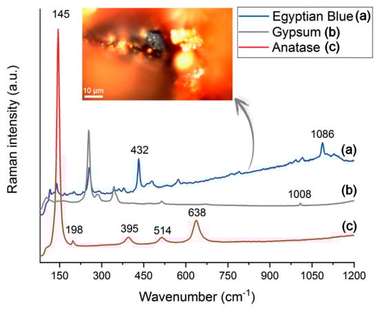 The Raman analysis of the pigment allowed the identification of cinnabar, based on the bands at 105, 145, 254, 284, and 344 cm−1. Contrarily to the XRD results, other impurities were also detected (see Figure 7), such as anatase (145, 198, 395, 514 and 638 cm−1), carbon (1300–1600 cm−1), diopside (667 cm−1), gypsum (416, 495, 621, 671, 1008, 1133 cm−1), and calcite (1087 cm−1). Interestingly, Egyptian Blue was found as a contamination of the pigment (see the blue particle in Figure 7) based on the Raman bands at 116, 139, 168, 232, 379, 432, 479, 573, 766, 789, 966, 989, 1014, 1086 and 1145 cm−1 [].