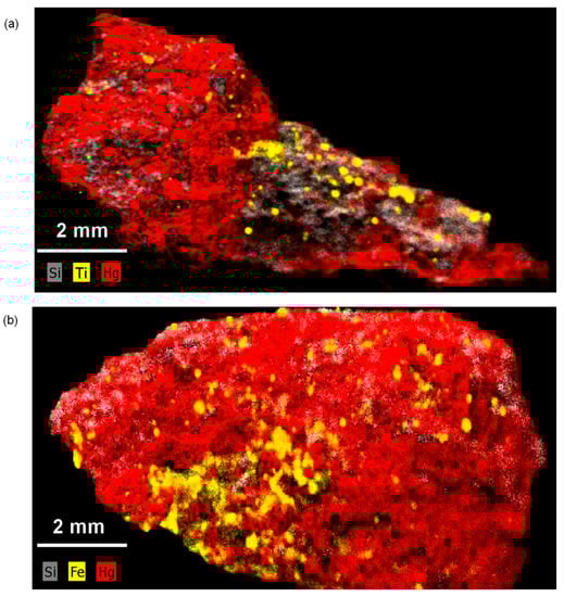 μ-EDXRF elemental maps also helped to evaluate the distribution of the elements on the ores (see Figure 8). Ti and Si accumulations were observed on a fragment from Almadén (anatase, quartz), as well as the presence of Fe and Si, which could be related to pyrite and quartz, respectively, on a fragment from El Entredicho.