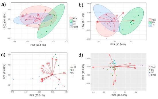Scores and loadings plot of: (a) the cinnabar ores and the raw pigment from Pompeii using the semi-quantitative dataset from benchtop EDXRF spectrometer, (b) the cinnabar ores using the semi-quantitative dataset from benchtop EDXRF spectrometer excluding Hg, (c) the cinnabar ores using the dataset (normalized counts) from HH-EDXRF spectrometer, (d) the powdered cinnabar ore samples and the raw pigment from Pompeii using the dataset (normalized counts) from benchtop EDXRF spectrometer.