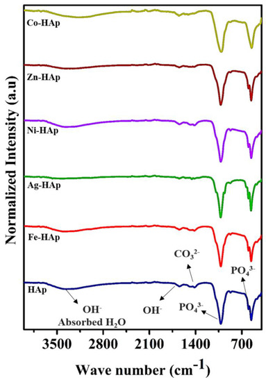 FTIR spectra of the HAp and different cation−incorporated HAp nanoparticles.