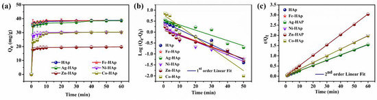 The adsorption kinetics was the most significant factor for determining the minimum operational time to reach the equilibrium adsorption state. Accordingly, the adsorption kinetics was carried out for 0 to 60 min. A total of 40 mg of the adsorbent dosage was mixed in 40 mL of 40 mg/L of CR concentration (pH 7) at ambient room temperature (303 K). Figure 4a shows the adsorption kinetics of the HAp and ion-doped HAp nanoparticles, which indicated a highly rapid CR adsorption (98%) within 1 min by the HAp, Fe-HAp, and Ag-HAp, whereas 75% and 50% CR adsorptions were observed using the Ni-HAp (1 min), Co-HAp (1 min), and Zn-HAp (10 min), respectively. To the best of our knowledge, the rapid CR adsorption within 1 min is the lowest adsorption time reported so far. Lagergren pseudo-first and second-order kinetics were fitted with the experimental kinetic data to identify the adsorption mechanism and their rate. The linear expression is given in Equations (7) and (8) [32,33].