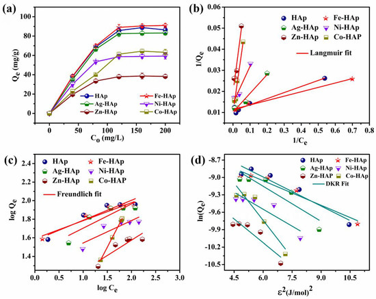 Figure 5a exhibits the maximum CR adsorption capacities of the HAp and modified HAp, with the different initial concentrations (40 to 200 mg/L). A total of 40 mg of the adsorbent was mixed at various CR concentrations at pH 7. The adsorption capacity was enhanced synergistically with an increase in the concentration of CR. Thus, the results indicate that the higher concentration provided a low resistance path and high driving force between the adsorbate and adsorbent, respectively. Accordingly, the maximum adsorption capacity increased from 38 to 86 mg/g for HAp, 39 to 91 mg/g for Fe-HAp, 35 to 83 mg/g for Ag-HAp, 30 to 59 mg/g for Ni-HAp, 20 to 38 mg/g for Zn-HAp, and 23 to 63 mg/g for Co-HAp. The maximum CR adsorption capacity of Ni-HAp, Zn-HAp, and Co-HAp was lower compared to HAp, Fe-HAp, and Ag-HAp. The higher adsorption capacity possessed by Fe-HAp qualified it as a potential adsorbent for removing CR from water compared to the other reports (Table 2). The equilibrium adsorption data were fitted to different isotherms of Langmuir, Freundlich, and DKR. These isotherm results explore the adsorption mechanism and type of the adsorption (i.e., monolayer or multilayer). The linear expression of the Langmuir, Freundlich, and DKR isotherms is given in Equations (9)–(11) [35,36,37,38]. In addition, the dimensionless Langmuir constant (RL), expressed in Equation (12), can be used to explore the adsorption favorability. The value of RL specifies the shape of the isotherm, such as if the CR adsorption is linear (RL = 1), disagreeable (RL > 1), agreeable (0 < RL > 1), or irreversible (RL = 0) [39,40].